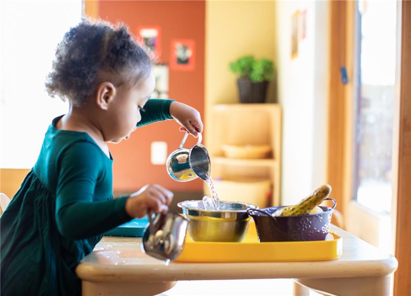 Montessori classrooms offer child-sized materials and clear routines that allow children to practice everyday skills independently, with teachers offering guidance as needed.
